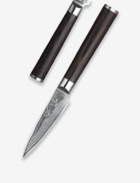 One of the exquisite tools with great elegance and uncompromised functionality is the Pairing knife from Damascus steel. This 3.5-inch knife is a perfect blend of style and functionality that can enhance your culinary experience in no time. It's crafted with the best forging technique that results in higher durability. The flowing water pattern captures attention. A secure and ergonomic grip comes from the Nature Ebony Wood handle, which is also smooth on the skin.