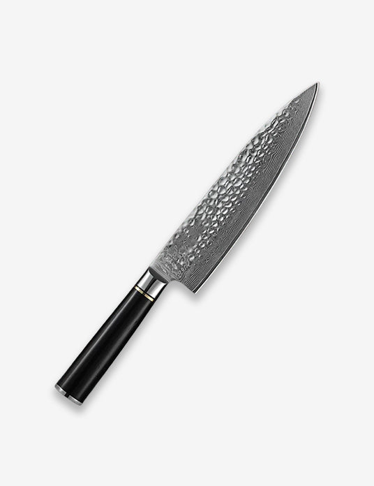 Get ready to get your hands on the meticulously crafted chef knife that can boost your culinary experience and let you unleash your creativity. The blade is coated with 67 layers of Damascus steel, which represents unparalleled sharpness and exquisite style. Each layer is perfectly folded and blended, enhancing its anti-corrosive properties. This knife is a perfect example of style-meeting functionality. The Ebony wood handle gives you an ergonomic-friendly grip and minimizes strain on your hands.