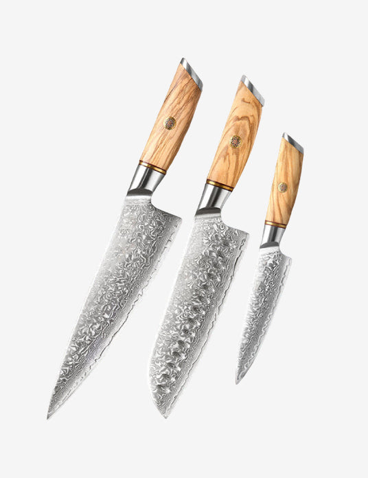 Here, you've got what you look for — it's the exclusive and stunning 3-piece Knife Set. Such poly handcrafted knives are made with the use of all four hands and with great inspiration. The present user will enjoy the Japanese-inspired accuracy of the 7-inch Santoku Knife when performing precise operations like slices of delicate vegetables and meats. As the last member in the trinity, the 5-inch Utility Knife is your best solution for peeling fruits, thinner cuts and trimming down to the most precise level.