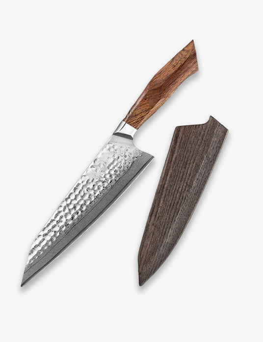 It is our pleasure to announce the debut of our 8-inch Chef Knife, fabricated from Original Japan 49 Layers SRS13 Damascus Steel. This is not merely a knife that would spend its life in the kitchen; this is a work of art. Each blade goes through a careful process of forging, which promotes enhanced sharpness and hardness and enables cutting products with greater ease every time. The handle is made from a very rare type of wood called ironwood, and it grants both of them beauty and ideal comfort for long-term use.